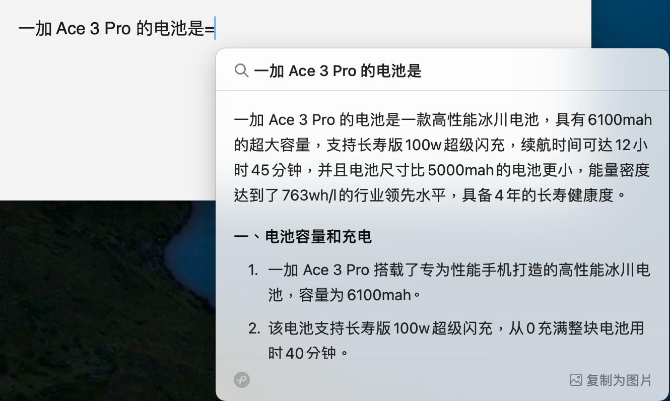 与腾讯搜狗输入法和百度输入法不同,目前微信输入法只有一种。 AI 功能,顾客也只能依赖于输入内容之后的添加。「=」,才能让 AI 产生答案。例如「在一加 Ace 3 Pro 的电池是」后加上「=」,AI 将直接回答一些相关信息,用于日常简单查询信息相当有用。