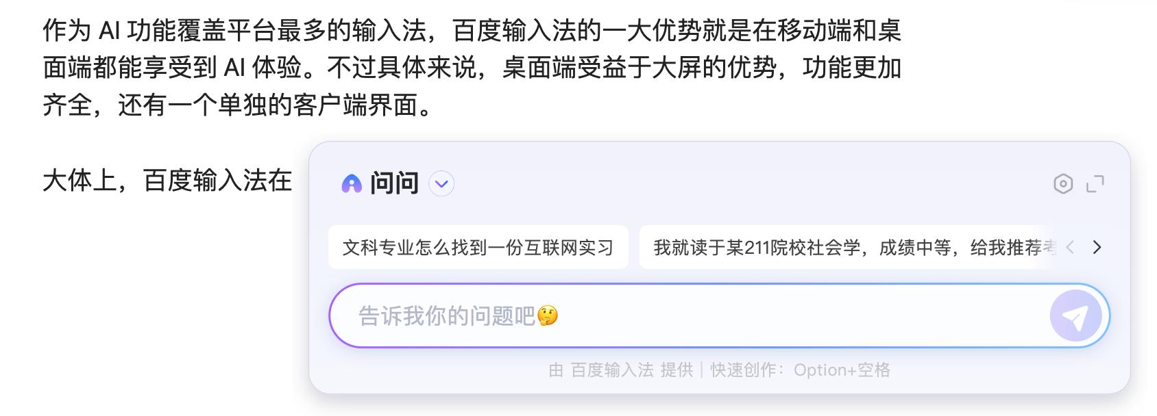对百度输入法而言 AI 功能性,目前已支持四大平台,即主流平台, Android、iOS、Windows 以及 Mac。微软的 SwiftKey 目前还没有桌面版,只是 Android 端支直接使用 Copilot,iOS 端还没有得到支持。