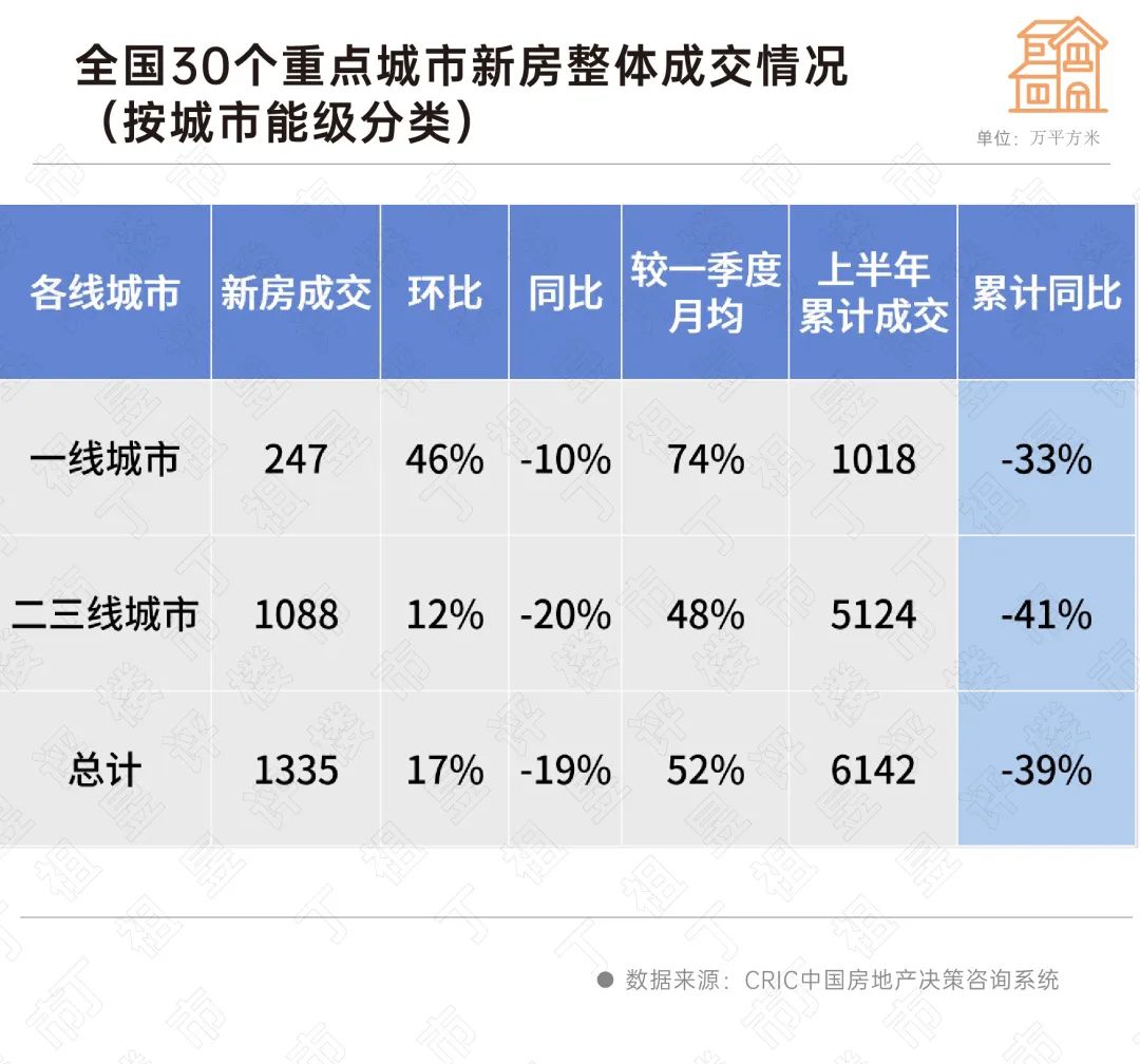 CRIC监测数据显示,六月份重点30个城市新房成交额1335万平方米,创新高,环比增长17%,同比下降19%。。与第一季度相比,平均增长52%。
