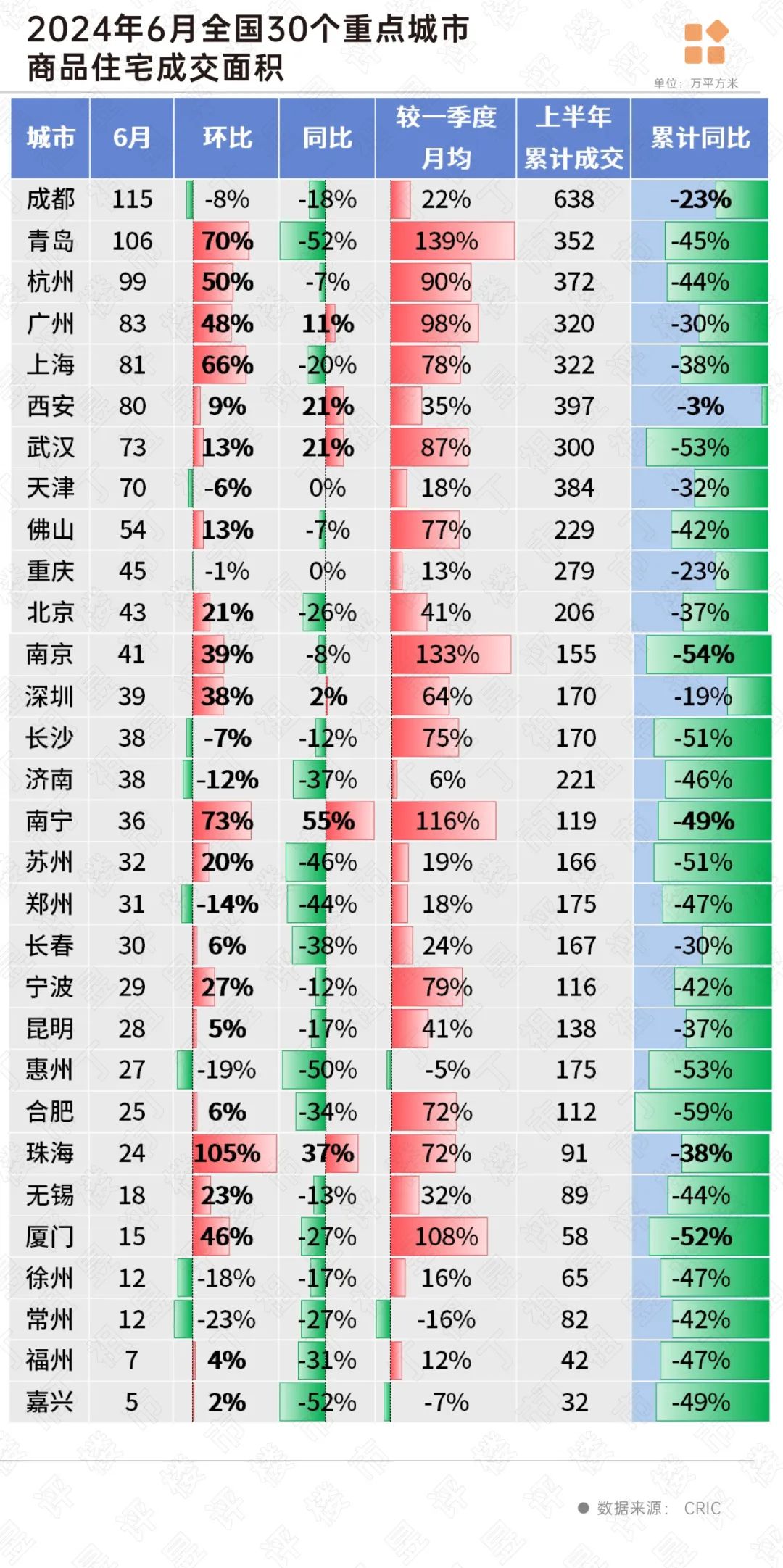 重点30城中,70%的城市新房成交环比上涨,一些城市在6月份迎来了阶段性的成交量。