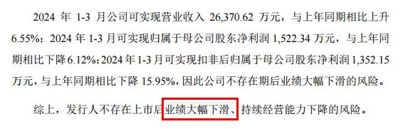 中达新材料被要求表明上市后业绩没有下滑的风险。中达新材料回复称,公司今年第一季度营业收入可达2.64亿元,同比增长6.55%;归母净利 同比减少6.12%的1522万元。;扣除后利润1352万元,同比下降15.95%。中达新材料强调,企业在有期后业绩不会大幅下滑。