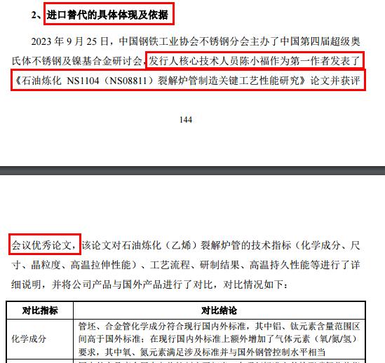 具体体现了中达新材被要求进口商品。公司回复称,公司核心技术人员陈小福作为第一作者,发表了《石油炼化NS1104(NS08811)裂解炉管制造关键技术性能研究》论文,并在石油炼化(乙烯)裂解炉管进口替代表现方面获得评价。论文将公司产品的技术指标与进口产品进行了比较,比较结果对于打破国外垄断具有重要意义。