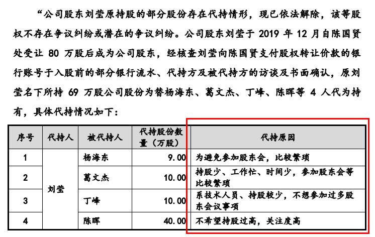公司在回复中透露,杨海东等四人通过刘莹持有股份的理由是:防止参加股东大会比较繁琐;仓位少,工作忙,时间少,参加股东大会比较繁琐;技术人员,仓位少,不想参加太多股东大会;我不想持仓太高,关注度高。