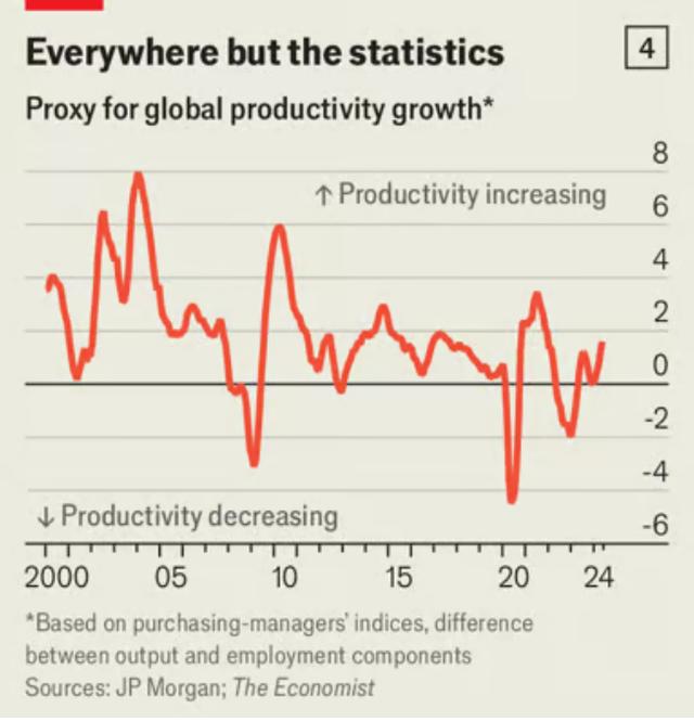 根据《经济学人》官方数据的最新估计,富裕国家每个劳动力的实际产出中位数根本没有增加。在美国,作为世界人工智能中心,一小时产出仍然低于2020年之前的趋势。
