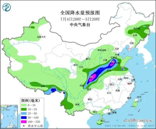 7月4日20:00至5日20:00,四川盆地中东部、陕西中南部、山西南部、河北南部、河南中北部、山东中西部、西藏东南部、云南西北部等部分地区暴雨。其中,四川盆地东北部、陕西南部、河北东南部、河南东北部、山东西北部等部分地区暴雨。
