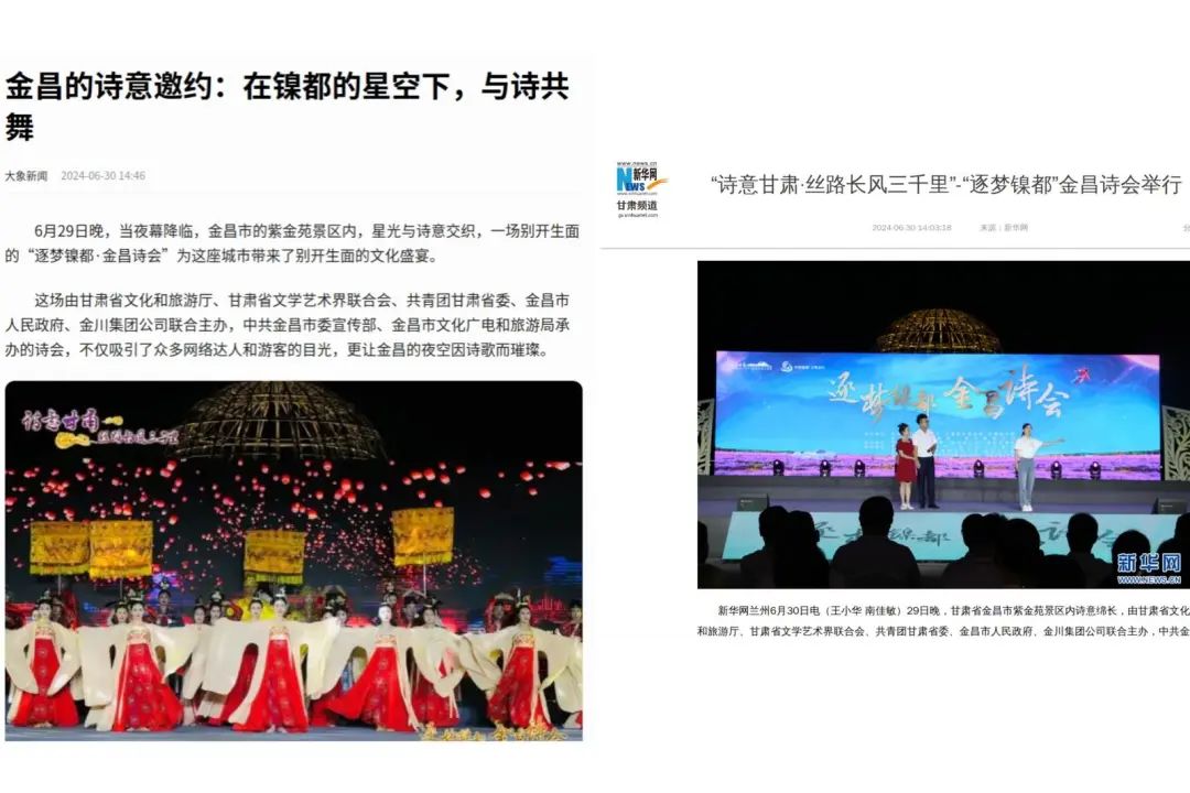 同时,积极对接国内知名新闻客户端,如新华网、人民网、中新社等。,以及封面新闻、上游新闻、大象新闻、天眼新闻、澎湃新闻等。,通过稿件推送、直播推送等方式,宣传、报道、转载、推送本次“金昌诗会”和采风创作活动,吸引更多人了解金昌,关注金昌,为金昌的文化旅游事业注入新的活力。