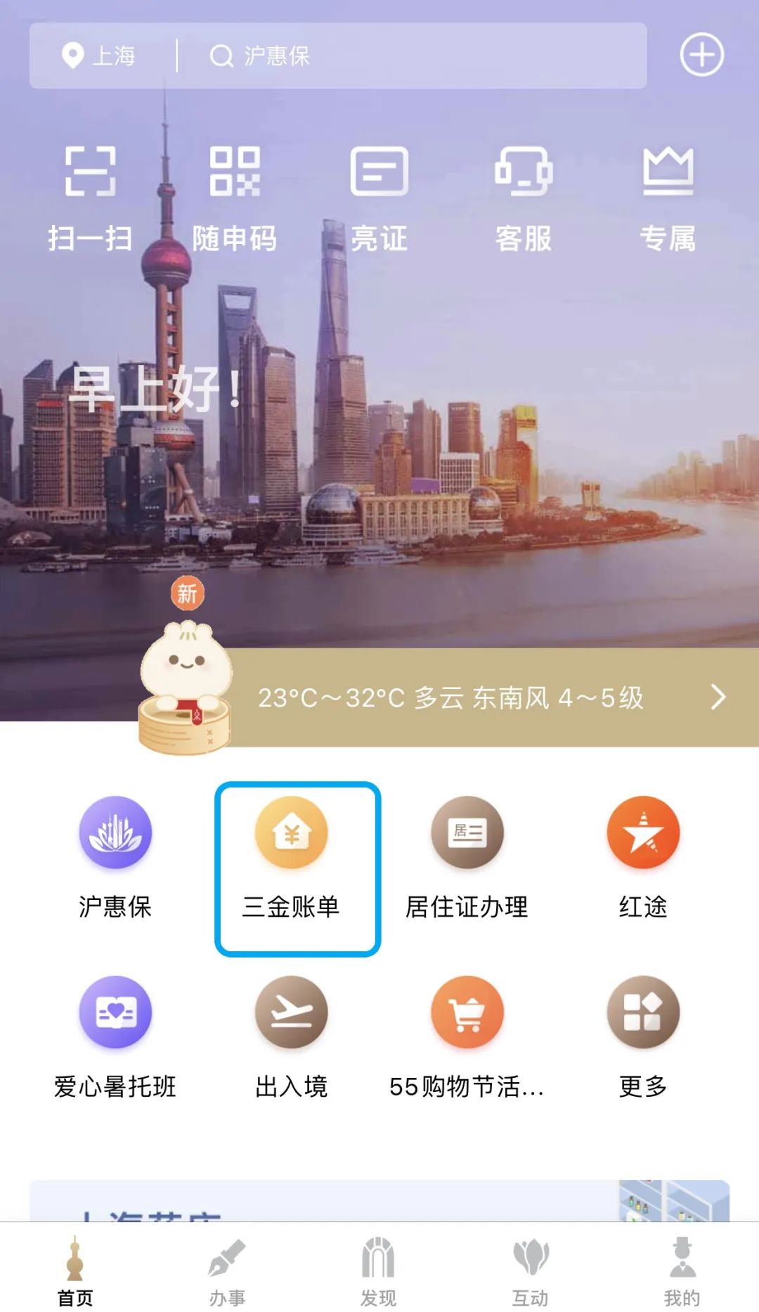 登陆“随申办市民云”APP后,点击“三金账单”。