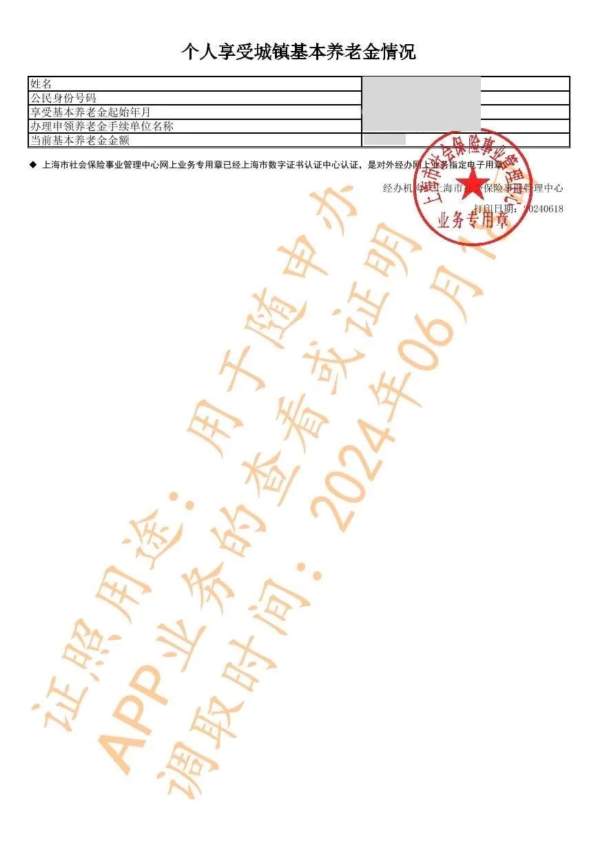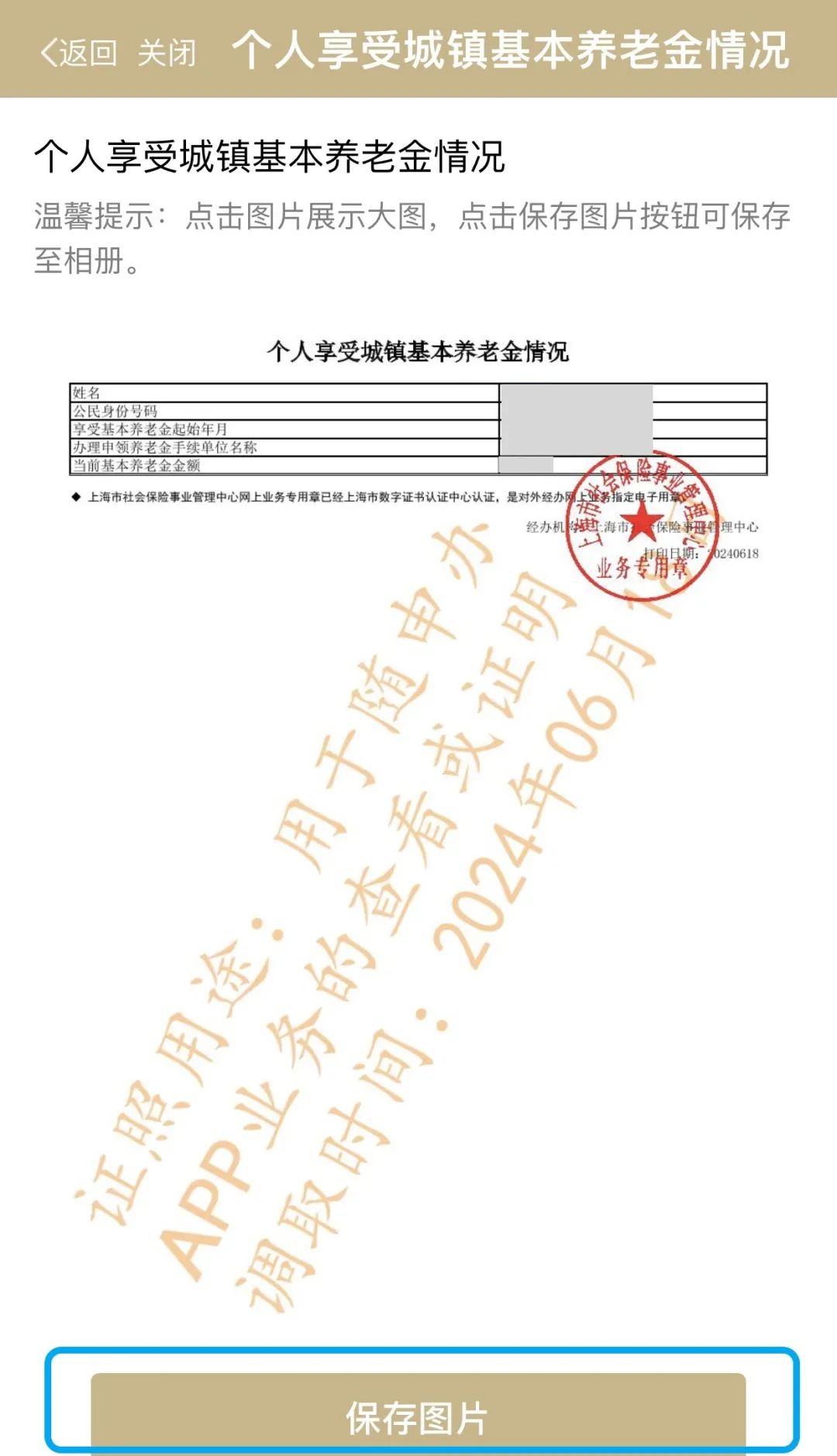 单击“保存图片”即可获得“个人享受城市基本养老金状况”,并加盖电子印章。