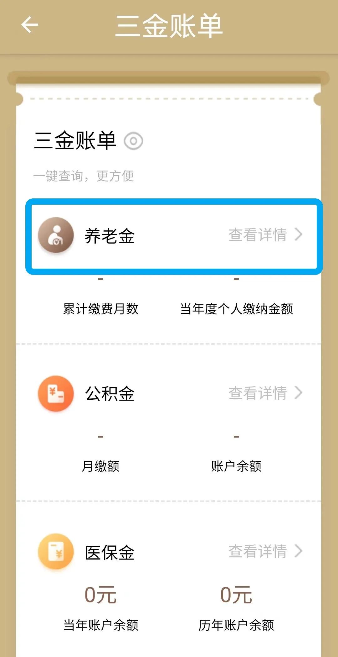 点击“养老金”板块的“查看更多”按钮,进入“三金账单”界面。