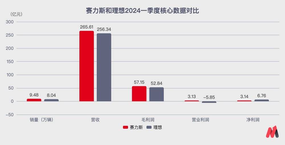豪华品牌定位带来的超高毛利率进一步提升了赛力斯的业绩。以2024年第一季度的几个核心数据为例,赛力斯的表现可以说是无限接近理想汽车。