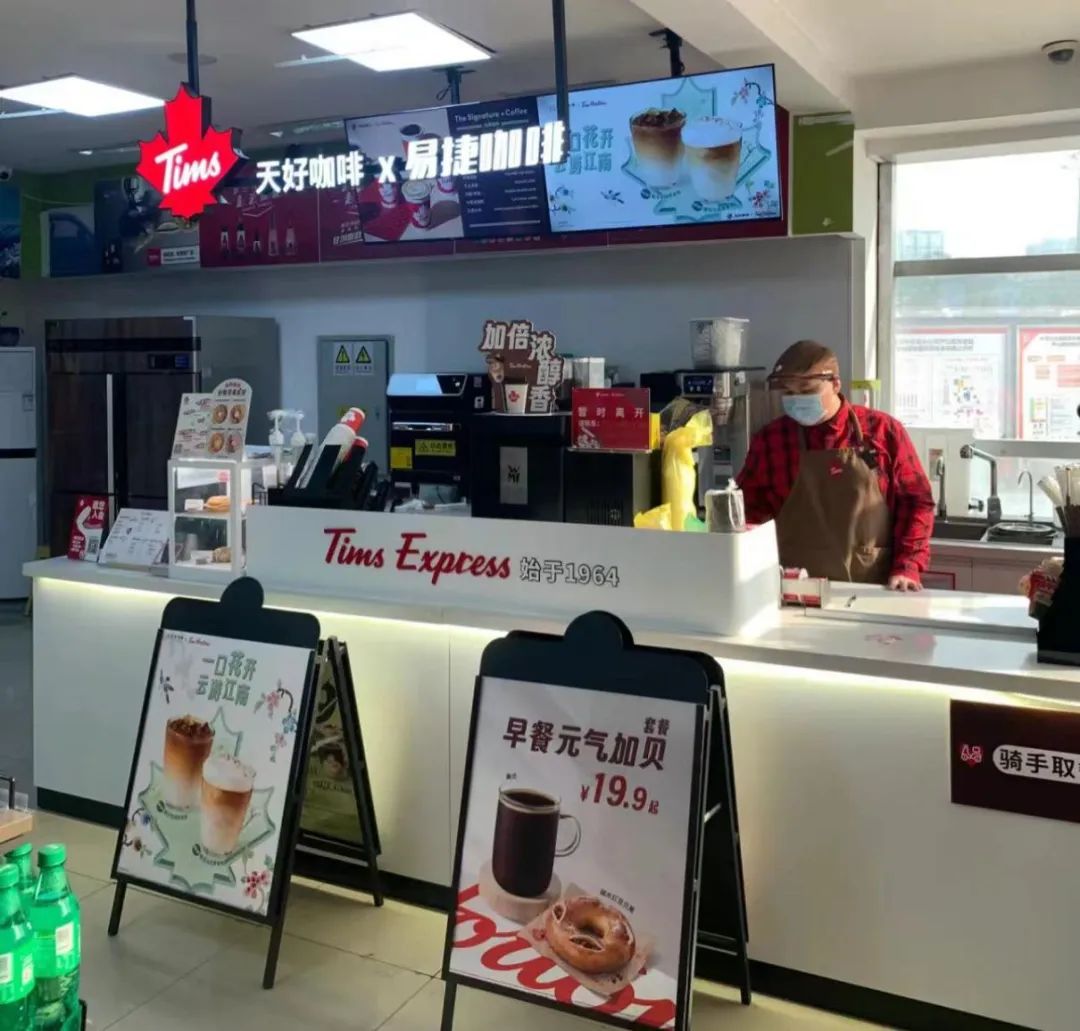 例如,库迪推出了便捷商店“COTTI Express“,但它不是第一个看便利店的咖啡品牌。去年5月,连锁咖啡品牌Tims与中石化的易捷便利店“结婚”,并推出了“易捷”×Tims Express"结合商店,占地面积只有20平方米左右。