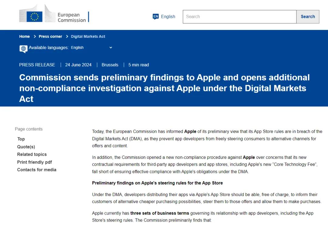 六月二十四日,欧盟委员会在官方平台上发布了调查报告,并通知苹果结果。这一起诉讼是欧盟委员会根据《数字市场法》提出的第一起诉讼。公告称,美国苹果的应用商店(App Store)他们担心苹果会限制开发者“自由引导用户”的能力,因为他们涉嫌违反欧盟的数字市场法案。