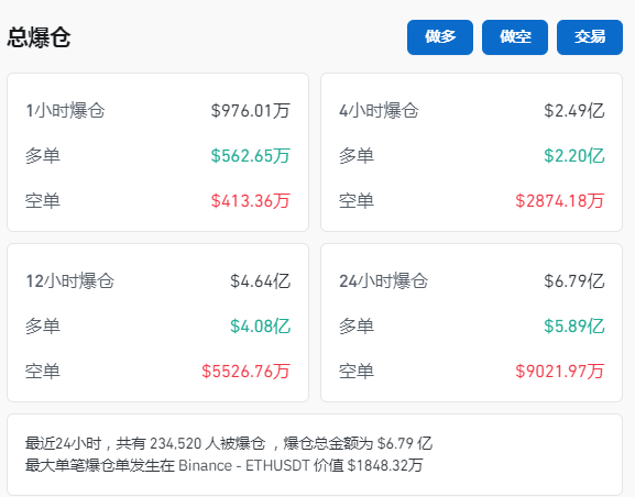 根据Coinglass的数据,在过去的24小时里,虚拟货币市场有超过23万人爆仓,总爆仓金额为6.79亿美元。