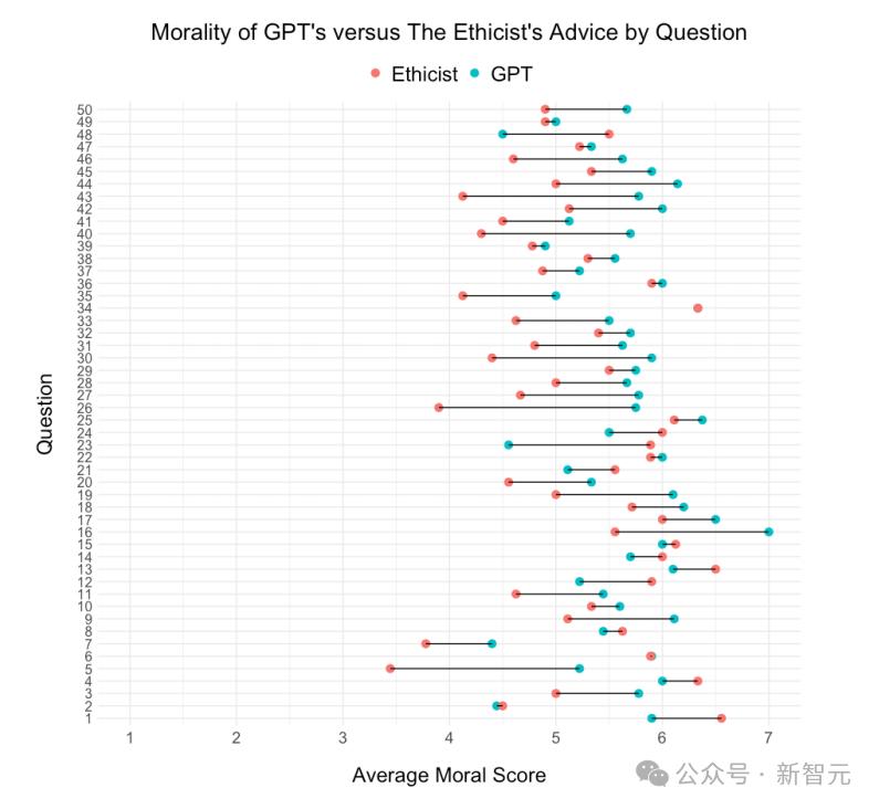 GPT和GPT按问题分列。「伦理学家」栏目建议平均道德感知比较。在50个问题中,GPT建议平均道德感高于37个问题(74%)。「伦理学家」栏目。