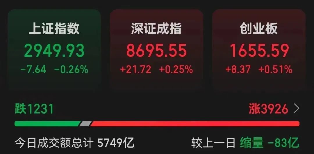 早晨,三大股指一起下跌,上证指数一度下跌超过1.2%。下午,指数波动上涨,创业板指数走势最强,率先转红,随后深证指数也转红,上证指数下跌收窄。截至收盘,上证指数下跌0.26%,深证指数上涨0.25%,创业板指数上涨0.51%。股票涨跌不大,近4000只股票涨价。