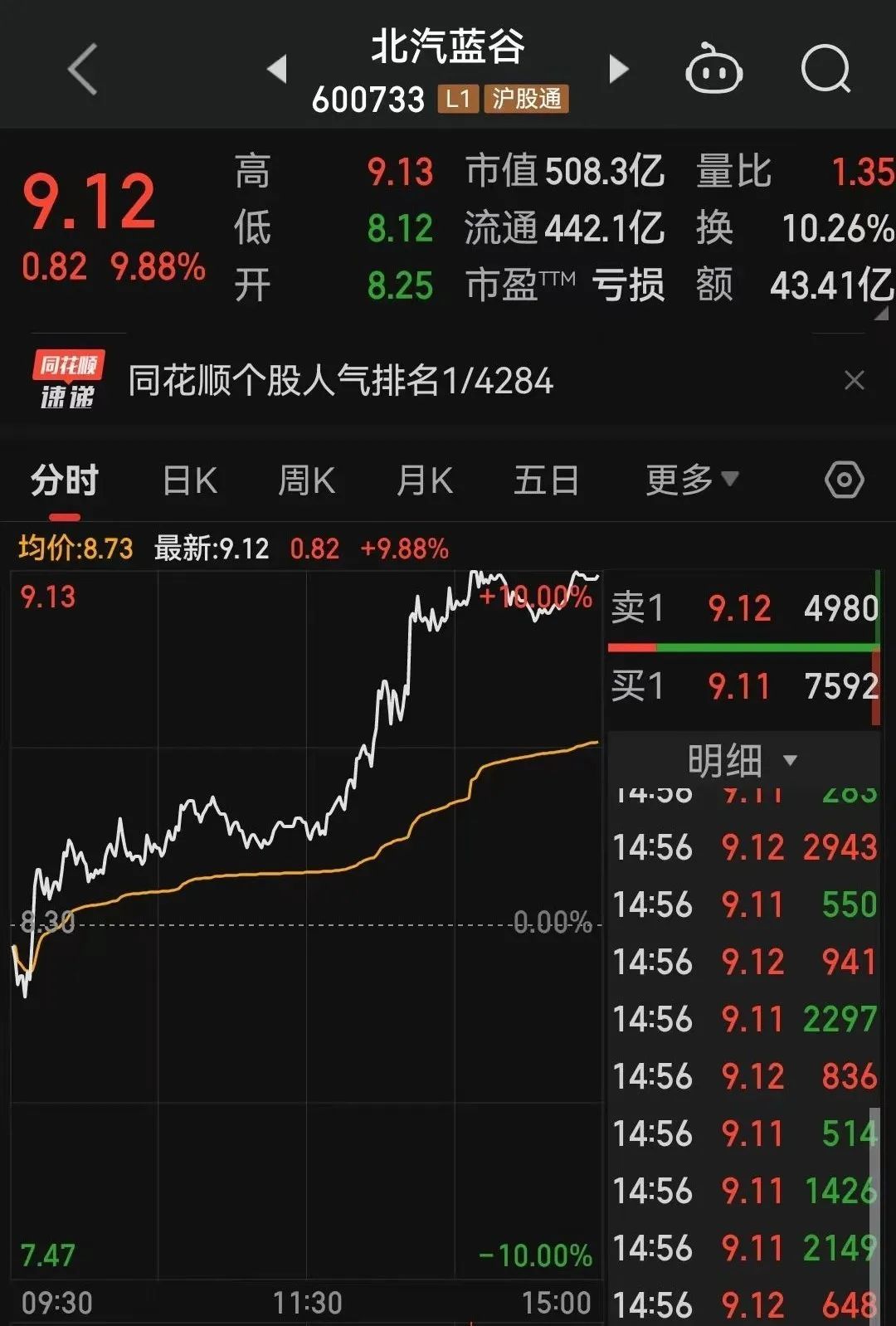 今日,北汽蓝谷再次登上同花顺热股榜第一。盘中一度涨停,截至收盘9.88%。