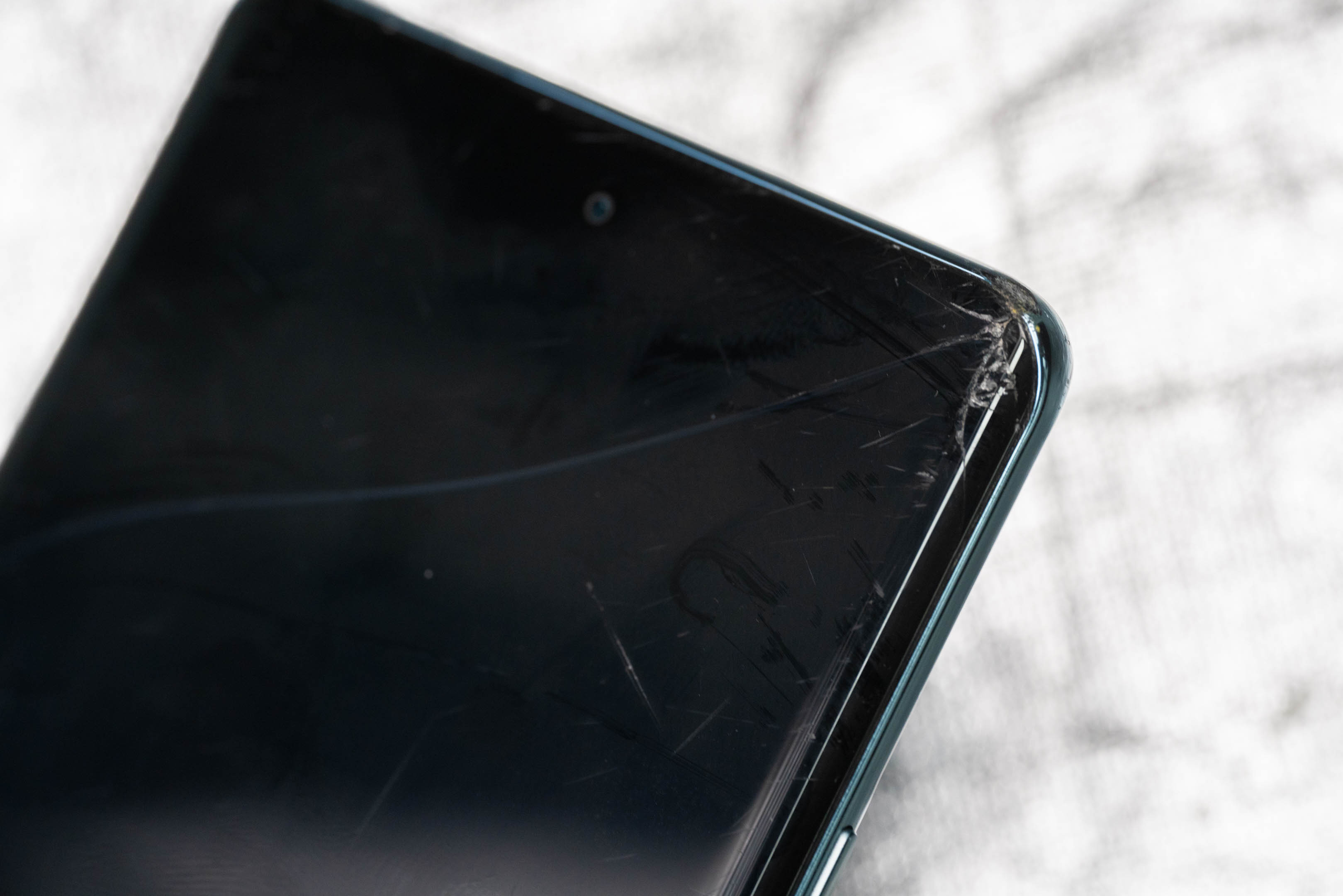 在检测中,OPPO A3 Pro 右上方首先碰到地面,导致屏幕破裂。随后的滚动过程中,中框左下方也遭受了严重的磨损,屏幕表面出现了明显的划痕。虽然 OPPO A3 Pro 其曲面屏和中框的抗冲击性能在日常使用中表现良好,但在高强度跌落测试中却表现不佳。