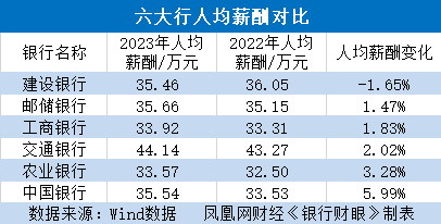 根据凤凰网财经《银行财眼》对Wind数据的整理,建行2023年人均工资为35.46万元,比2022年的36.05万元同比下降1.65%,是国有六大银行中唯一一家人均工资下降的银行。与此同时,其他五大银行的人均工资增长了2.92%。