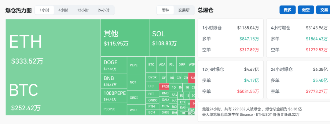 与此同时,在最近24小时内,共有229382人遭遇了暴力仓库,暴力仓库总额为6.38亿美元。Binance发生了最大的每个爆炸单。–ETHUSDT,价值1848.32万美元。