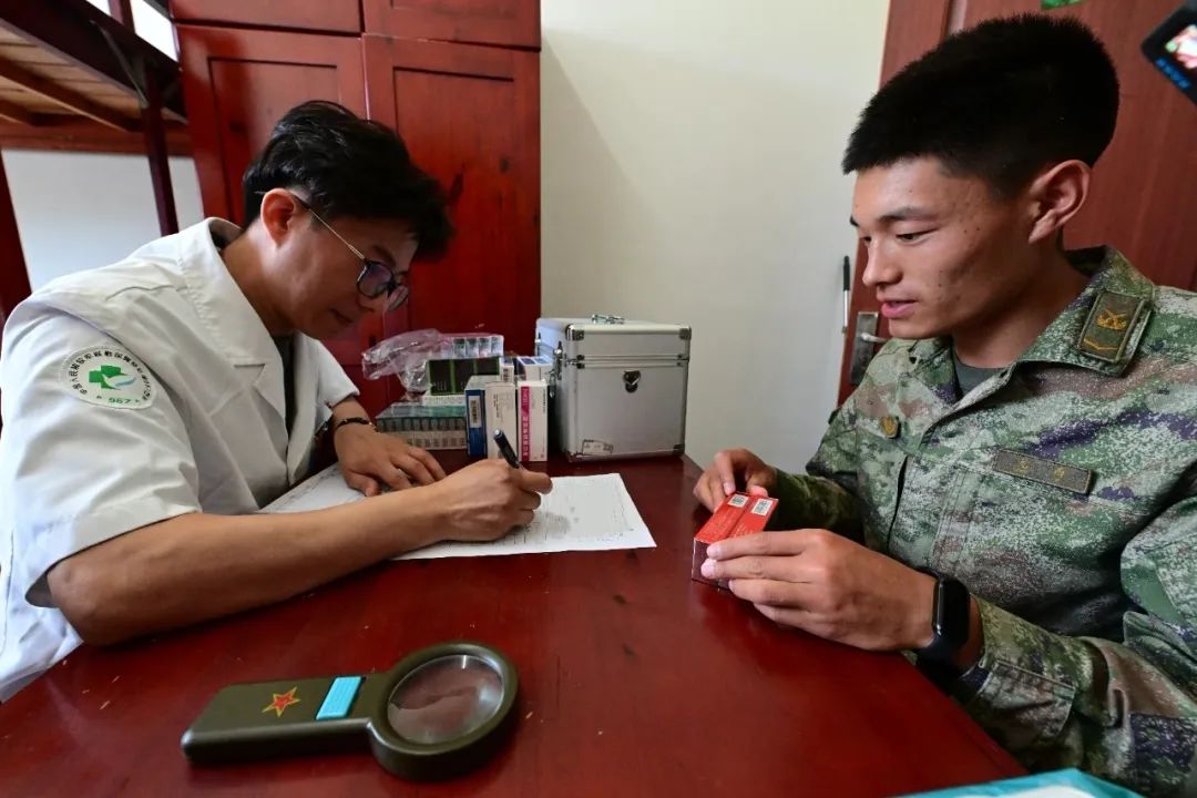 巡视现场,医疗队员认真对士兵进行全身检查,针对常见疾病,出具现场诊治医嘱,指导科学安全训练,传授预防疾病的方法。