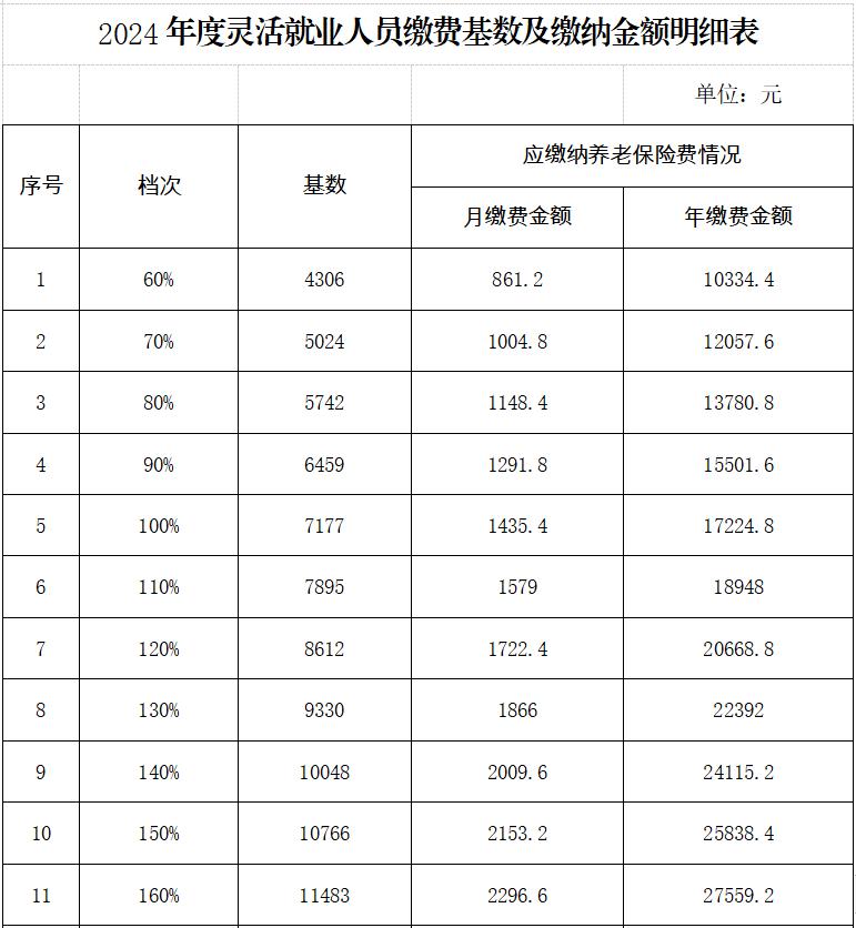 2024年,个人灵活就业人员共有25个缴费等级供参保人自行选择,每个缴费等级见下表。存款基数一经支付人员确定,今年不得更改。