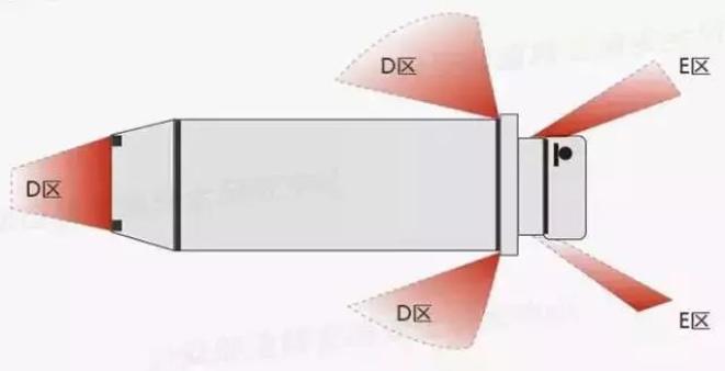 D、e区域是一个完全盲点,司机在这些区域根本看不到。d区域在驾驶员的直视范围和三个后视镜的视线范围之外。e区域是由挡风玻璃两侧的柱子遮挡驾驶员视野形成的。