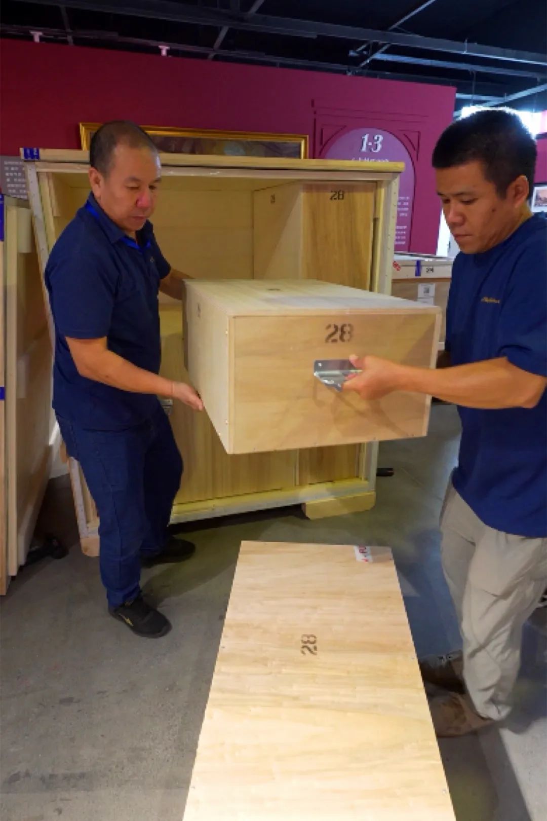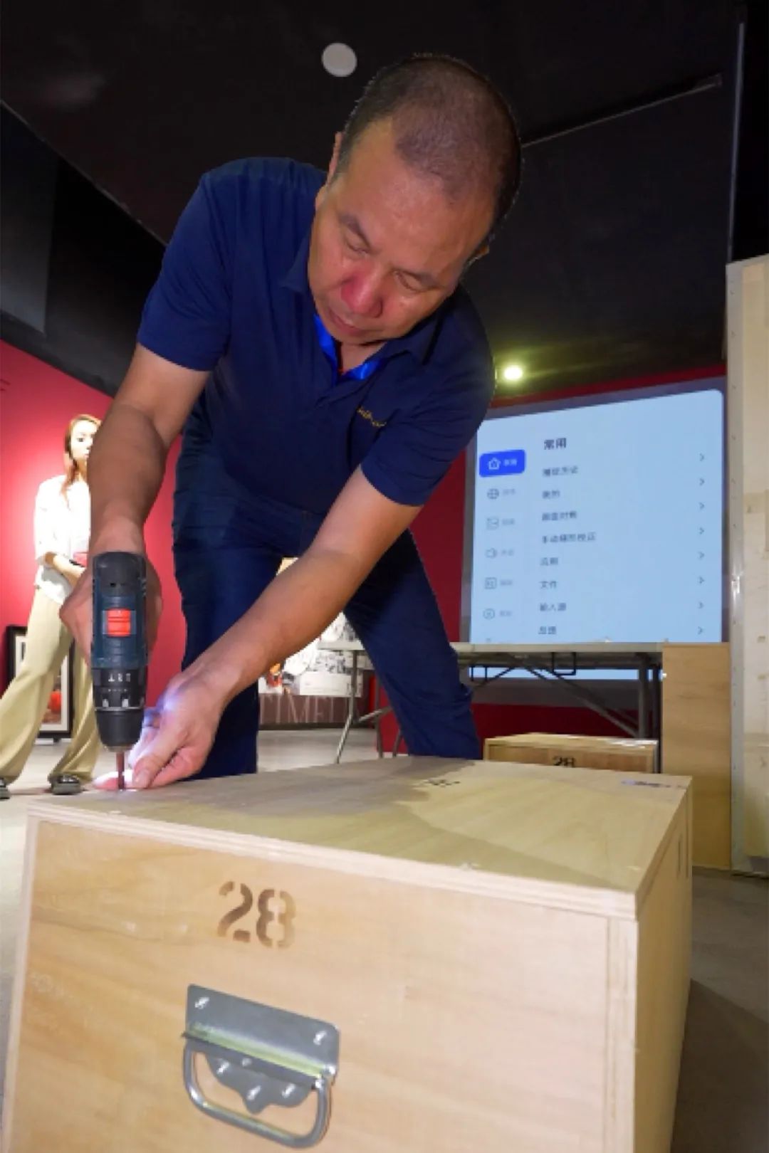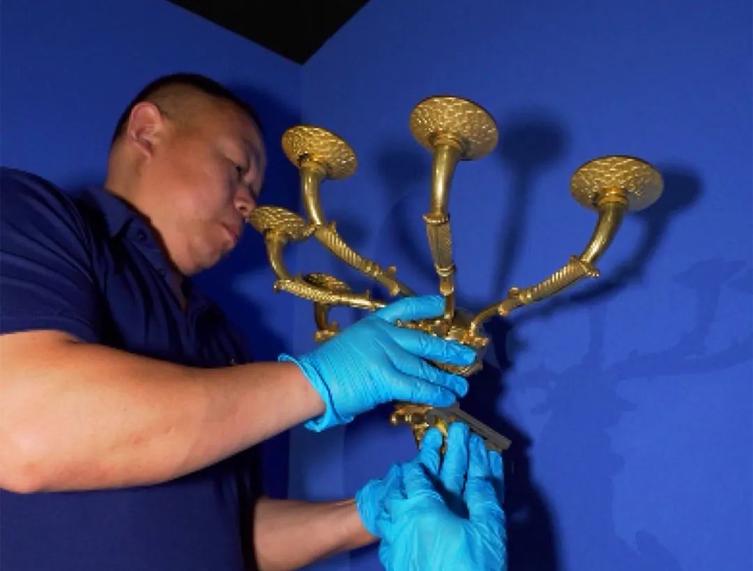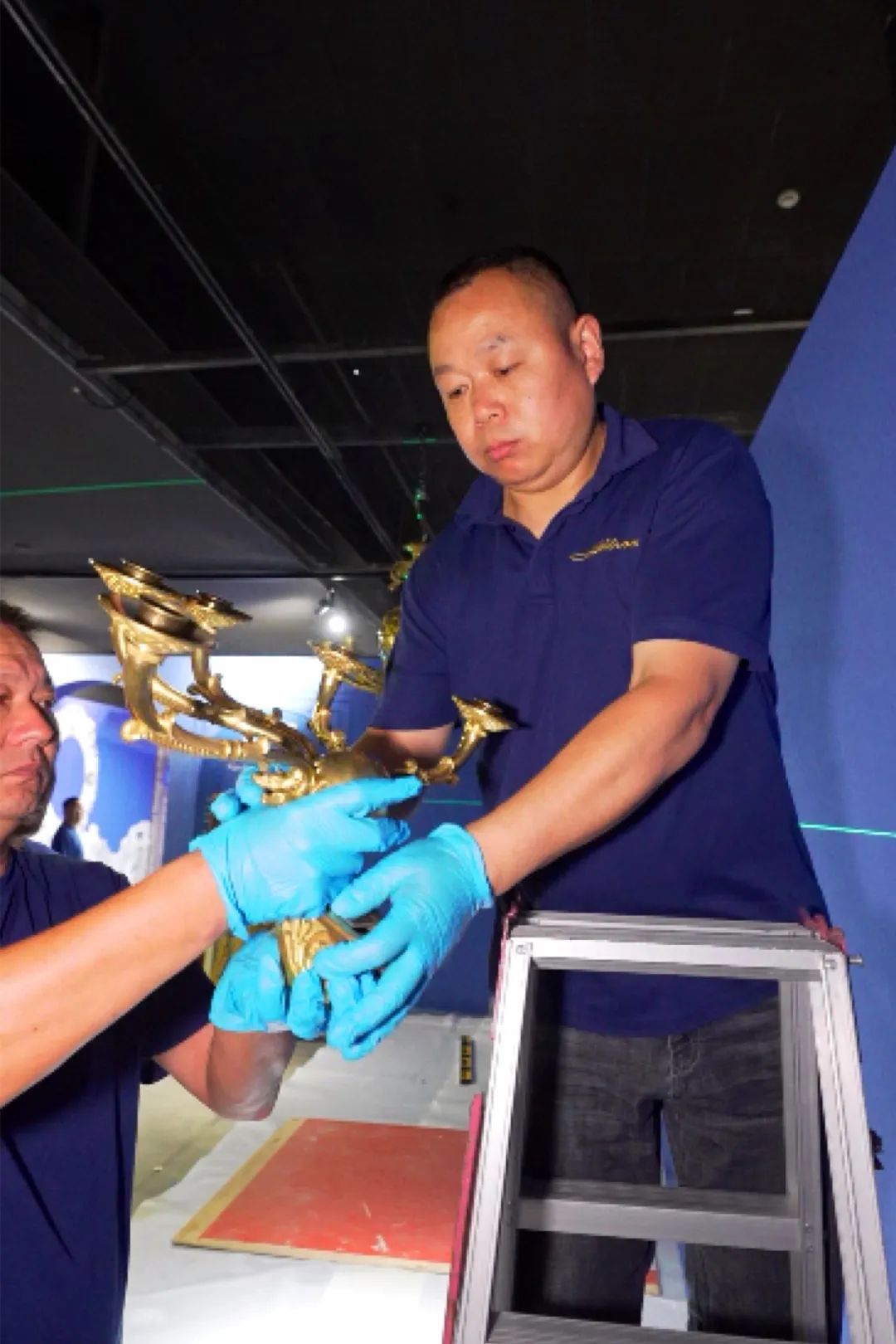 7月4日,记者在展览现场看到,工作人员正小心翼翼地从木箱中取出一对铜灯臂,仔细检查后完成点交。然后,灯臂小心翼翼地安装在相应的摊位上。