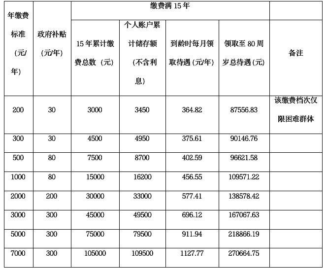 从2024年1月1日起,全市居民基本养老保险个人缴费等级调整为8档,分别为200元、300元。 、500元,1000元,2000元,3000元,5000元,7000元。其中,200元是参保政府代缴的低保对象、特困人员、伤残人员、低保边缘户等困难群体。累计缴费不足15年的,最高缴费等级不得超过每年5000元。2023年以前(含)缴纳7500元的城镇居民,2024年以后仍可连续缴纳7500元,期间如有中断或减少等级缴费,次年起按现行规定标准(第8档7000元)执行最高等级。