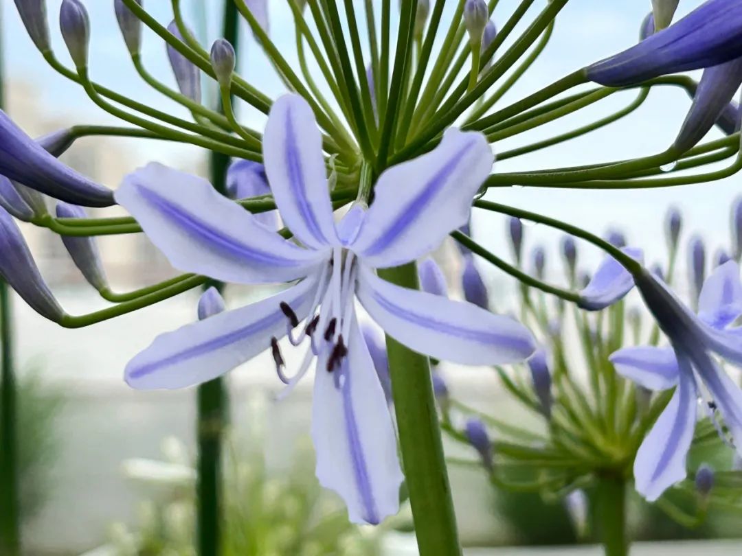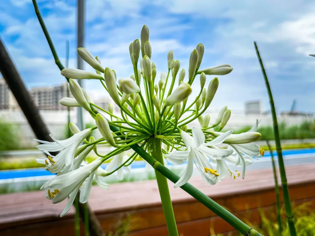百子莲是石蒜科百子莲的一种草本植物,原产于南非,有鳞茎;叶条状披针或带形,近革质,从根茎中抽出,花期7~八月份,百子莲因其花多而得名,其花语代表“爱情的访问,爱情的交流”。