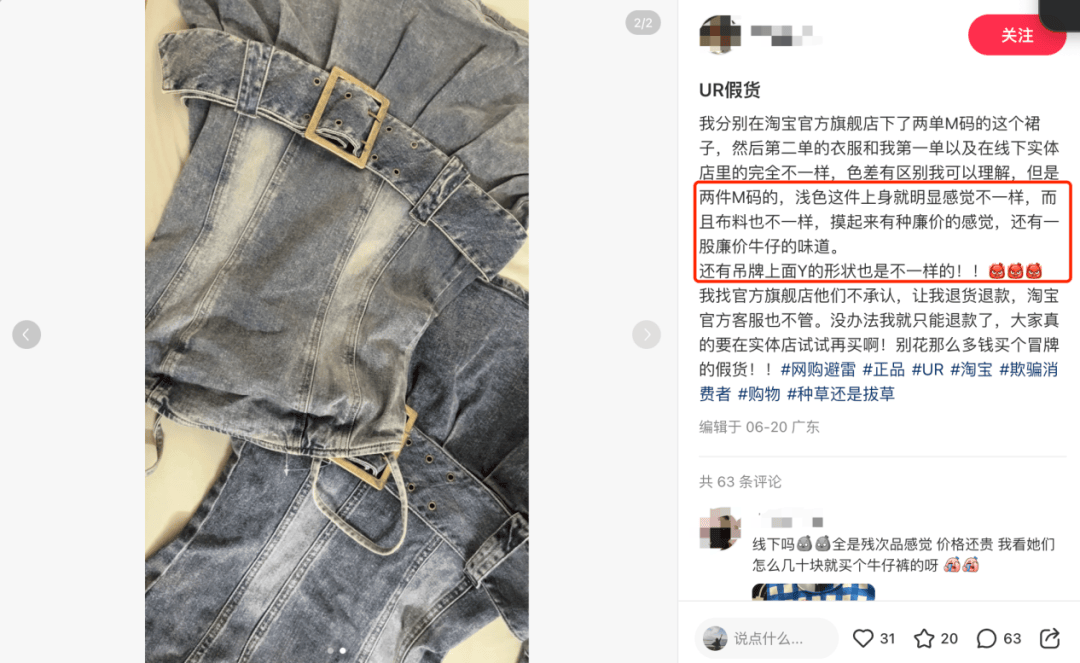 社交平台上,还有许多关于吐槽UR服装质量“以次充好”的问题、质量控制不严格,甚至在官方旗舰店购买“假货”帖子。