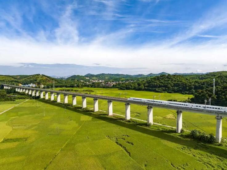 六月二十九日,广西壮族自治区梧州市大坡镇河步村,万亩稻田与入境的广昆高铁、美丽村庄相映成趣。何华文摄(中经视觉)