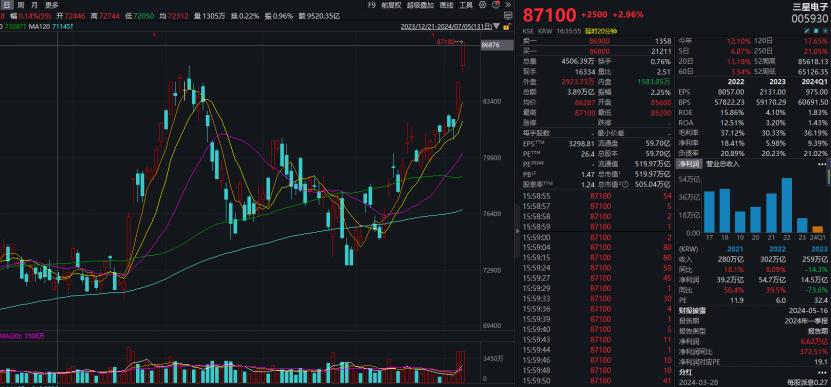 当天,在财务报告的刺激下,三星电子股价上涨了近3%,创下了近三年的新高,市值也上升到了519.97万亿韩元,相当于约2.76万亿元。它还推动了韩国综合指数上涨1%以上,创下2022年1月至今的新高。