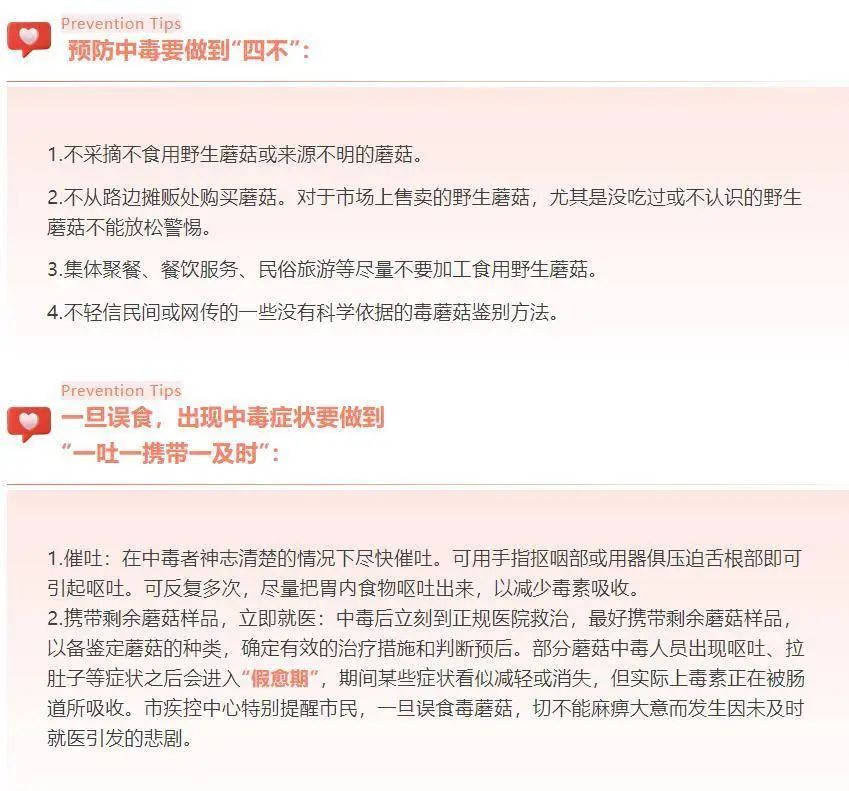医生提醒:不要随便吃野生真菌,尽量不要生吃或混吃野生真菌,吃野生真菌的时候一定要煮熟。吃之前最好拍照或者留样。一旦出现中毒症状,可以为医生提供判断依据。如果吃野生真菌后出现胃肠道症状或精神症状,应立即就医,并在就医路上用温盐水扣吐,最大限度减少毒素残留。