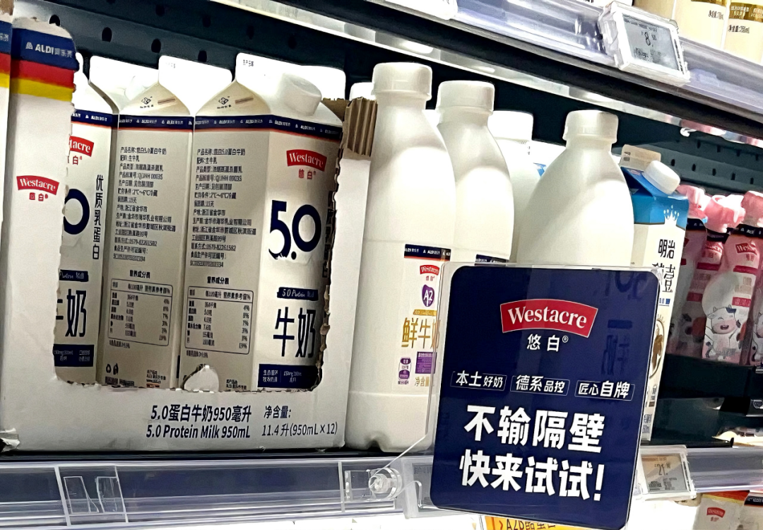 作者发现,在奥乐齐自有乳制品“白色”的货架上,“不要输给隔壁,快来试试吧!”口号,白色旁边是深受消费者喜爱的明治牛奶。一个是“尽力推销自己”的自主品牌,一个是世界知名品牌,顾客自然会“用脚投票”。