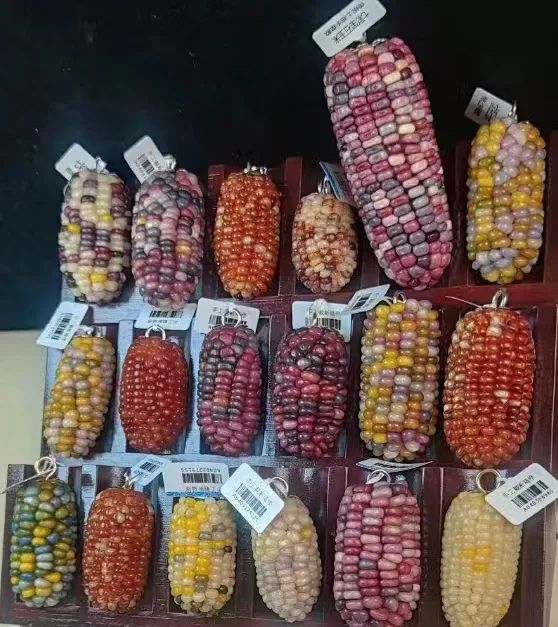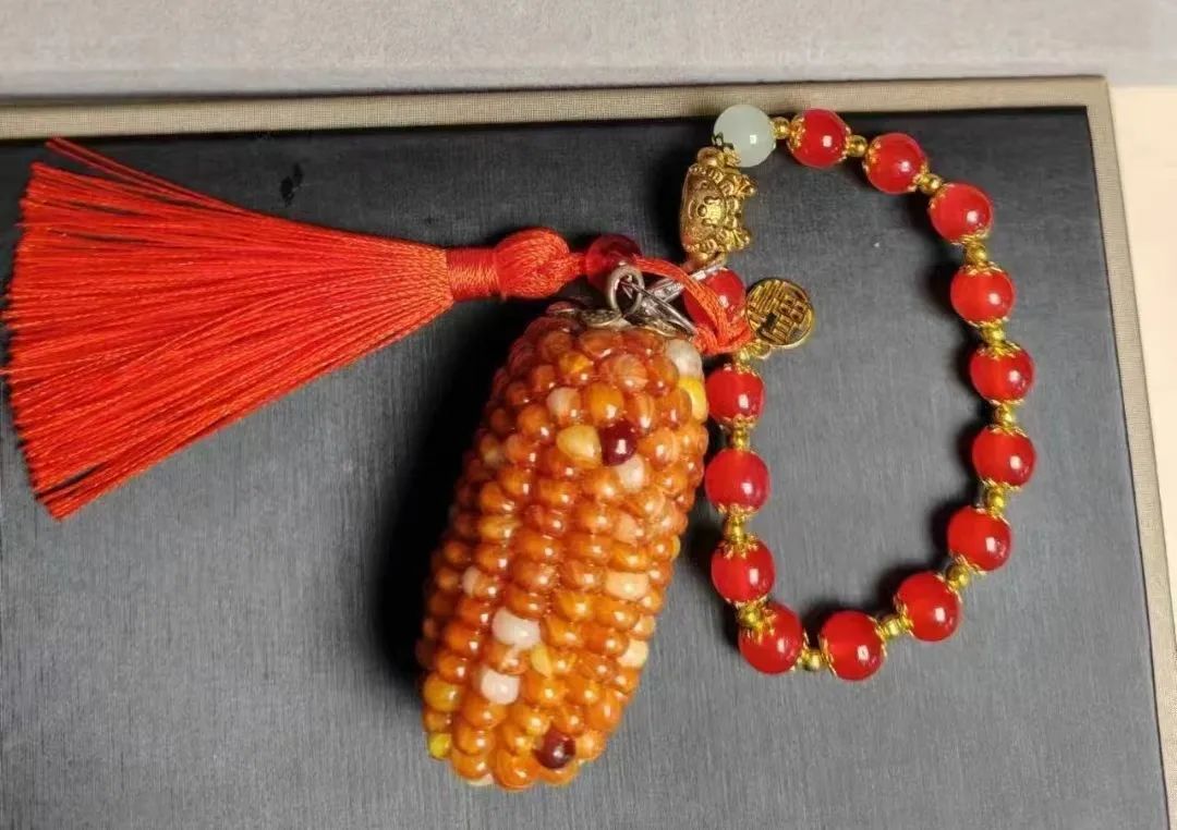 小玉米的两端是关键。细小的头部要求是颗粒饱满,厚厚的一端安装925银花托,有的还要加一串硫璃珠或者火红的流苏。