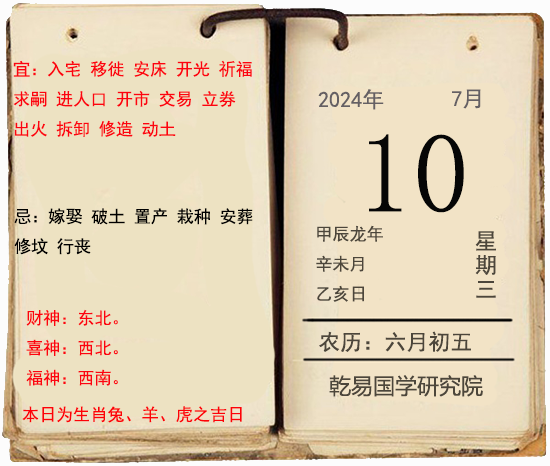 时间:阳历:阳历:2024年7月10日;阴历:【龙年】六月初五;年次:甲辰龙年 辛未月 乙亥日。
