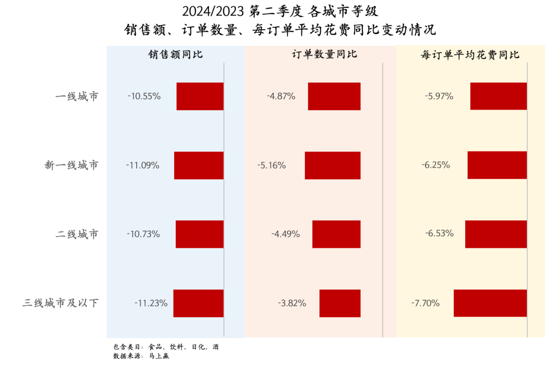 从2024Q2和2024Q1的环比来看,随着天气的升温,线下零售订单数量明显增加。然而,随着Q1春节传统消费高峰的结束,销售额和平均订单消费数量明显下降。