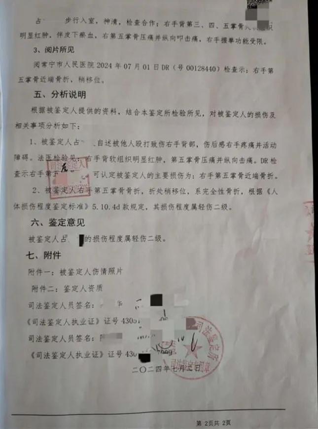据调查和占某文本人证实,他的左手掌骨受伤(被认定为轻伤二级)是他敲打谭某文头部时造成的,而不是对方造成的。经法医鉴定,谭某文和林某然都受了轻伤。