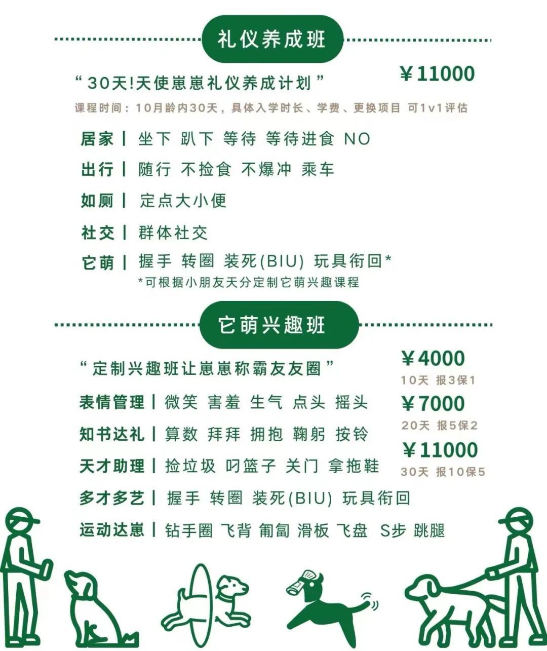 根据该工作人员的说法,园区内的课程培训需要单独安排培训,分为礼仪培训班和兴趣班,在这些课程中,礼仪班主要进行坐、趴、随行、定点大小便、人群社交、握手、假死等教学,期限为30天,收费1.1万元。兴趣班主要是对宠物进行点头、摆头、鞠躬、按铃、关门、拿拖鞋、玩具衔接、爬行、飞盘等教学,有三种不同的周期课程:10天、20天、30天,收费分别为4000元、7000元、1.1万元。