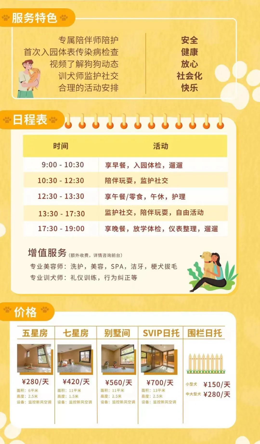 作为消费者,中新经纬咨询了北京市朝阳区一所主要推广“高档寄养”的宠物幼儿园,相关人员发来的小狗日托班介绍显示,“有房日托”按房间大小和类型收费分别为280元/天、420元/天、560元/天、700元/天,“围栏日托”小狗每天150元,中大型犬每天280元,家长可选择校车接送或自行接送,包括一日三餐、陪伴玩耍、监控社交、自由活动、遛狗等特点。