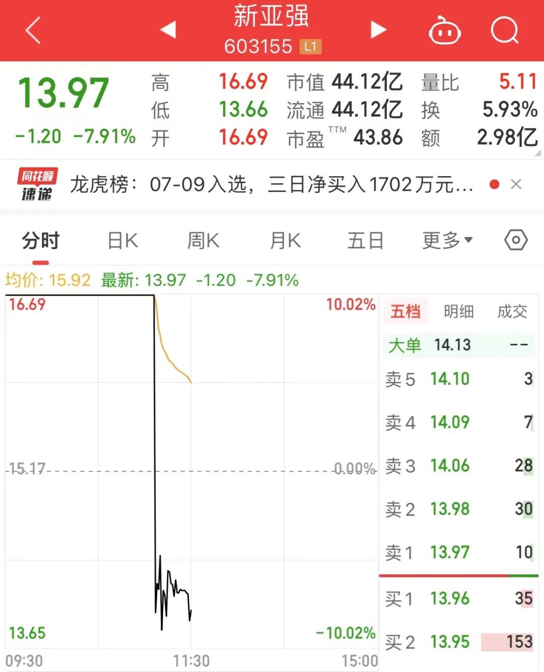 最近大牛股新亚强,开盘一字涨停,迎来五连板,早晨收盘,股价突然暴跌,最低达到13.66元,距离跌停价13.65元只有1分钱。新亚强早晨下跌7.91%。