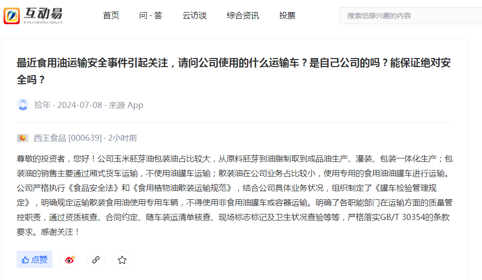 7月9日,王西食品在互动平台上表示,公司玉米胚芽油包装油占比较大,从原料芽到油脂生产,再到成品油生产、罐装、包装一体化生产;包装油的销售主要是通过箱式卡车运输,而不是通过卡车运输;散装油在公司业务中所占比例相对较小,用专用食用油卡车运输。