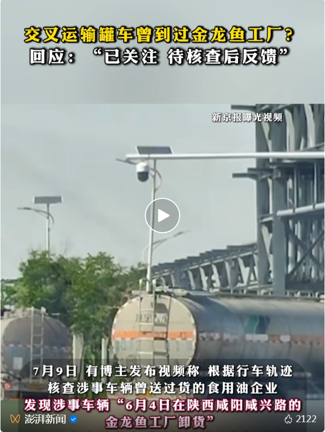 此外,7月9日,一位博主发布视频称,根据行车轨迹,对涉案车辆送货的食用油公司进行了审查,发现涉案车辆“6月4日在陕西咸阳咸兴路金龙鱼厂卸货”,金龙鱼卷入“罐车运输乱象”事件,迅速登上微博热搜。