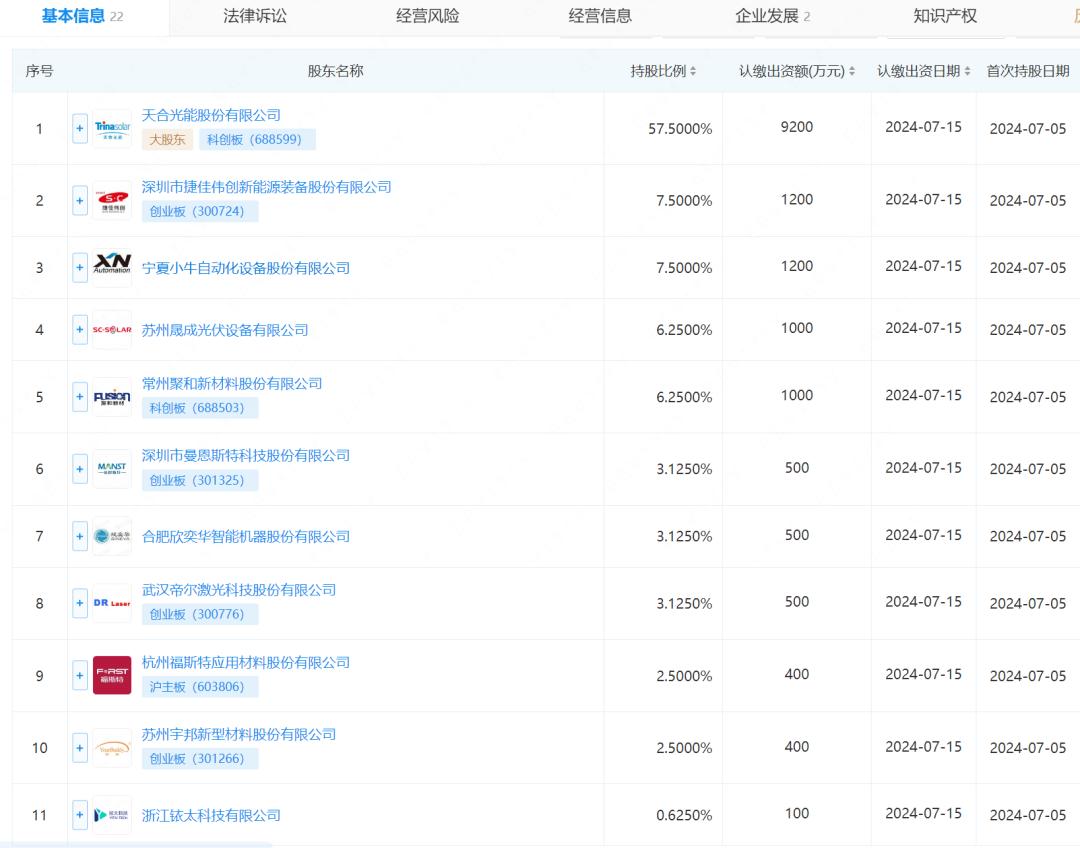 根据工商信息,江苏群创光伏科技有限公司于今年7月5日成立,注册资本1.6亿元,其背后有11家产业链企业。其中,天合光能持股比例达到57.5%,包括捷佳伟创、甘肃小牛自动化设备有限公司、苏州盛成光伏设备有限公司、聚和材料、曼恩斯特、合肥欣弈华智能机器有限公司、帝尔激光、福斯特、宇邦新材料、浙江淞太科技有限公司在内的10家公司均有股份。