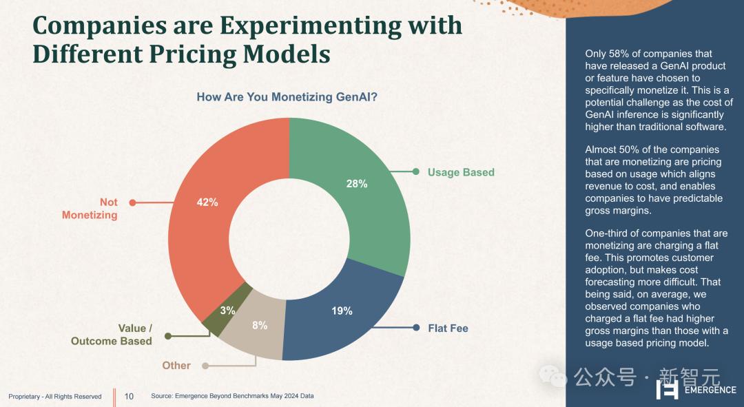 与传统软件公司相比,推理和培训的计算费用将花费更多的资金。但是,根据Emergencence 根据Capital的统计,只有58%的GenAI公司选择通过产品盈利,这就增加了另一个商业风险。