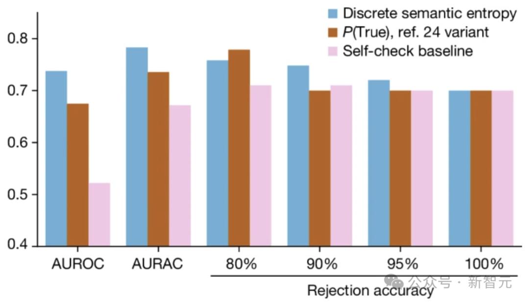 图中的结果是五个数据集的平均值,表明语义熵及其离散相似性均优于句子长度产生的最佳基线。