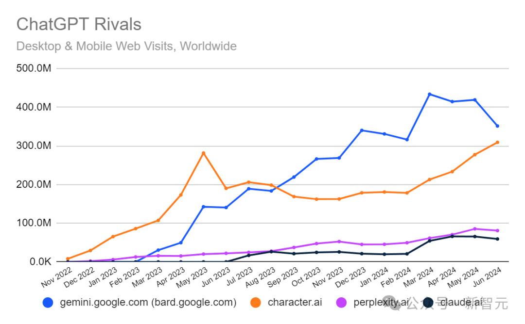 竞争者正在努力跟上 ChatGPT的增长步伐。Gemininiiniini是谷歌最大竞争对手。 与上个月相比,六月的浏览量下降了16.6%。
