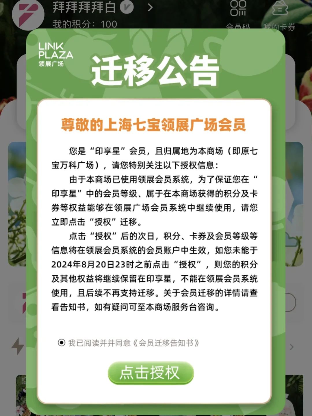 在上海七宝领展广场更名后,原来的“印享星”会员系统也被“领展会员系统”所取代。为了保证用户在“印享星”中的用户权益,需要在2024年8月20日23:00前点击“授权”迁移到展会广场会员系统。如果未能如期点击“授权”,积分等权益将继续保留在印享星,不能在展会会员系统中使用,后续不再支持转移。成功的会员转移之后,需要重新打开无感积分,以便记录和使用各种会员特权。第一次开通无感积分后,顾客还可以领取1小时免费停车券。
