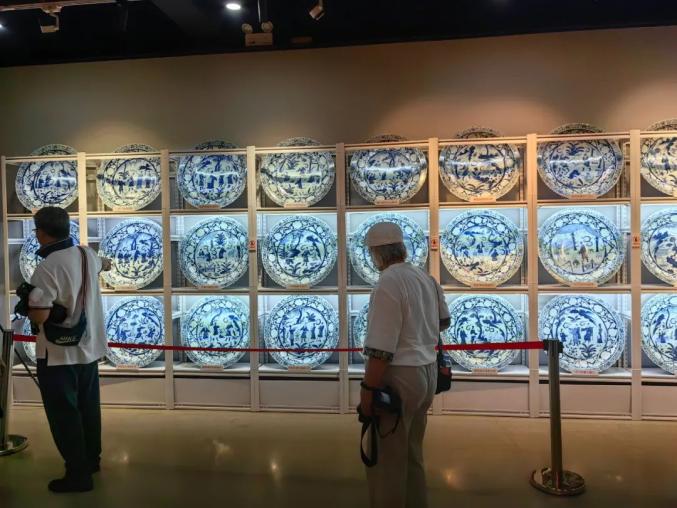 走进展厅,小嘉看到每个瓷盘直径70厘米,高度约9厘米,前面充满了三层图案。瓷盘外面是玉叶缠绕的枝条,中间的圆圈是白牡丹缠绕的枝条,直径约43厘米,非常抢眼。瓷盘背面是门式分离莲花花瓣图案,外缘是沿菱形边缘折叠的青花。据顾永梁介绍,所有展品的标准、发色和锻造风格都是统一的,目前收藏行业还没有发现类似的物品。
