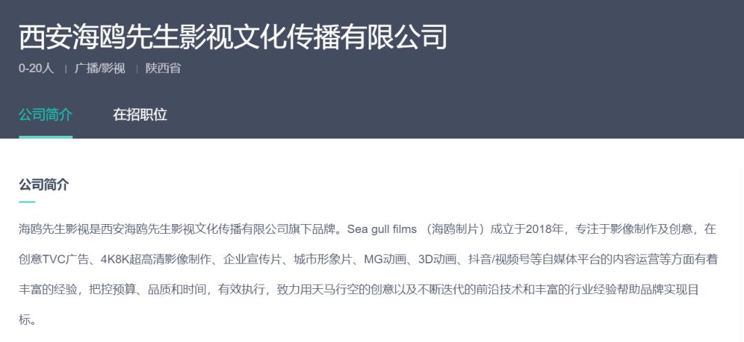 公开资料显示,西安海鸥先生影视成立于2018年,致力于影像制作和创意。
